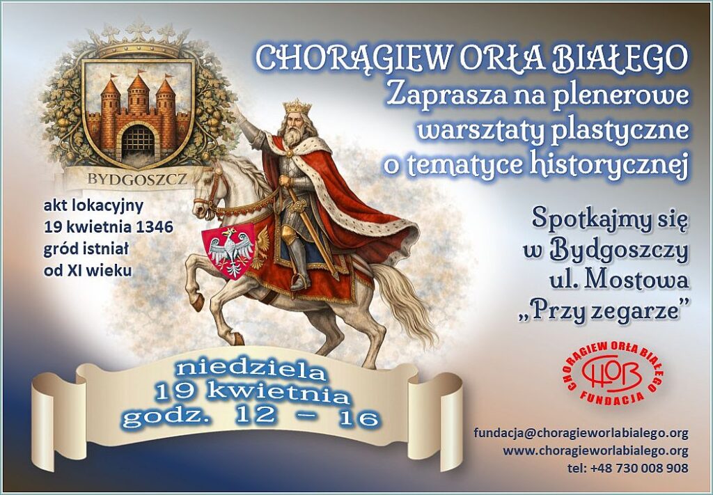 2. Temat: 19 KWIETNIA 680 ROCZNICA NADANIA PRAW MIEJSKICH BYDGOSZCZY PRZEZ KRÓLA KAZIMIERZA WIELKIEGO. Przedstawimy uczestnikom do wyboru 12 grafik z wizerunkiem herbu miasta Bydgoszcz oraz Orła Białego z epoki Kazimierza Wielkiego.